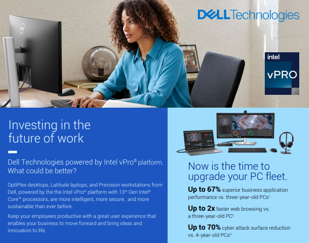 OptiPlex desktops, Latitude laptops, and Precision workstations from Dell, powered by the the Intel vPro® platform with 13th Gen Intel® Core™ processors, are more intelligent, more secure, and more sustainable than ever before.